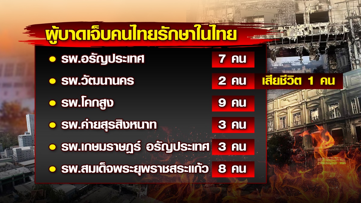 สำหรับคนไทยที่ได้รับบาดเจ็บที่ถูกส่งเข้ามารักษาในประเทศไทย รายงานล่าสุดเมื่อเวลา 08.20 น. จำนวน 32 คน ประกอบด้วย ที่ รพ.อรัญประเทศ 7 คน, รพ.วัฒนานคร 2 คน, รพ.โคกสูง 9 คน, รพ.ค่ายสุรสิงหนาท 3 คน, รพ.เกษมราษฎร์ อรัญประเทศ 3 คน และ รพ.สมเด็จพระยุพราชสระแก้ว 8 คน