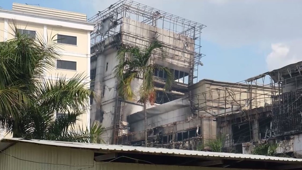 จากนั้นคณะได้เดินเท้าข้ามสะพานมิตรภาพไทย-กัมพูชา ไปดูจุดเกิดเหตุเพลิงไหม้ที่อาคารบ่อนกาสิโน “แกรนด์ไดมอนด์” ซึ่งด้านหน้าเป็นอาคารกาสิโนสูง 8 ชั้น ด้านหลังเป็นอาคารใหม่ หรืออาคารวีไอพี สูง 17 ชั้น และฝั่งตรงข้ามอาคารกาสิโน เป็นอาคารที่พักสูง 7 ชั้น โดยมีสะพานลอยเชื่อมต่อ พบมีสภาพถูกเพลิงไหม้เสียหายทั้ง 3 อาคาร โดยเฉพาะอาคารกาสิโนสูง 8 ชั้น ถูกเพลิงเผาเสียหายจนตึกเอียงอย่างเห็นได้ชัด เสี่ยงต่อการถล่มเป็นอย่างมาก ขณะที่เจ้าหน้าที่หน่วยกู้ภัยและกู้ชีพของไทยหลายมูลนิธิ รวมกว่า 100 นาย ยังคงร่วมกันช่วยเหลือและค้นหาผู้ประสบภัยในซากอาคารที่ไฟไหม้ พร้อมกำชับเจ้าหน้าที่ทั้งทหาร ตำรวจ และเจ้าหน้าที่กู้ภัย กู้ชีพ ให้เร่งช่วยเหลือคนไทยอย่างเต็มที่