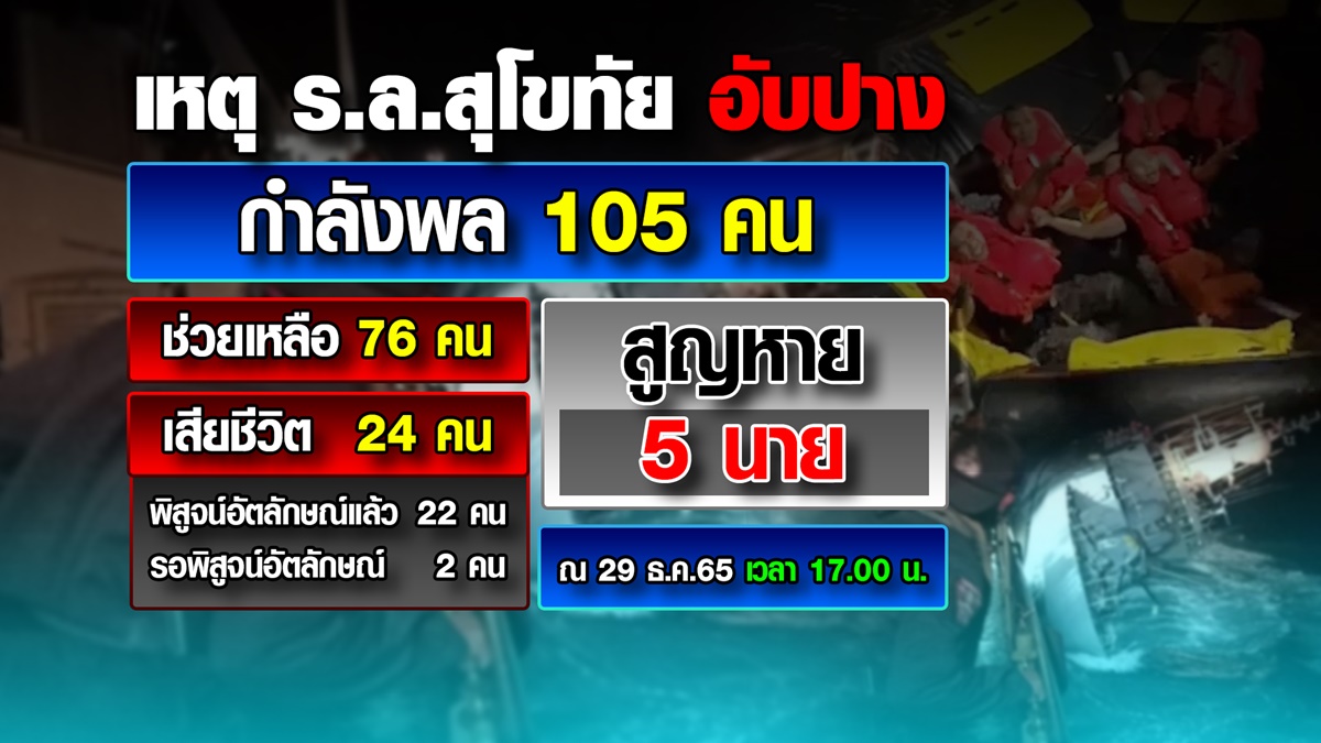 สรุปการช่วยเหลือผู้ประสบภัย จนถึงวันนี้ (29 ธ.ค.65) ยอดกำลังพล 105 นาย รอดชีวิต 76 นาย เสียชีวิตรวม 24 นาย ในจำนวนนี้สามารถระบุชื่อได้แล้ว 22 นาย และมีหลักฐานบ่งชี้ว่าเป็นกำลังพลกองทัพเรือและอยู่ในกระบวนการของการพิสูจน์เอกลักษณ์เพื่อยืนยันตัวบุคคล 2 นาย คงเหลือผู้สูญหาย 5 นาย. – สำนักข่าวไทย