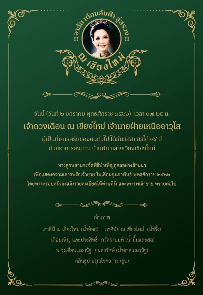 เชียงใหม่ 2 ม.ค. – สิ้นแล้ว “เจ้าดวงเดือน ณ เชียงใหม่” ถึงแก่กรรมอย่างสงบ ณ บ้านพักกลางเวียงเชียงใหม่ สิริอายุ 94 ปี ลูกหลานเตรียมจัดพิธีบำเพ็ญกุศลแบบล้านนา ในเดือน ก.พ.66 โดยจะแจ้งให้บุคคลทั่วไปทราบอีกครั้ง