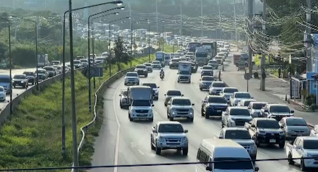 นครราชสีมา 3 ม.ค.-เช้าวันนี้ การจราจรถนนมิตรภาพ ช่วง อ.ปากช่อง จ.นครราชสีมา ยังติดหนึบ โดยเฉพาะช่วงขึ้นลงเนิน หน้าฟาร์มโชคชัย กม. 51-52