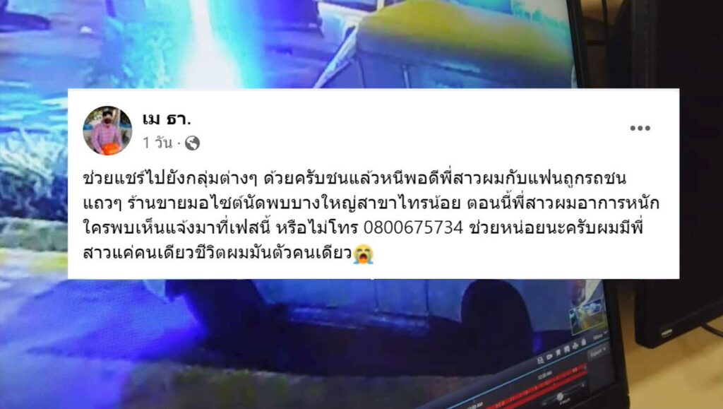 จากกรณีเฟซบุ๊กรายหนึ่ง โพสต์ภาพจากกล้องวงจรปิด โดยระบุว่า “ช่วยแชร์ไปยังกลุ่มต่างๆ ด้วยครับชนแล้วหนีพอดีพี่สาวผมกับแฟนถูกรถชนแถวๆ ร้านขายมอไซต์นัดพบบางใหญ่สาขาไทรน้อย ตอนนี้พี่สาวผมอาการหนัก ใครพบเห็นแจ้งมาที่เฟสนี้”