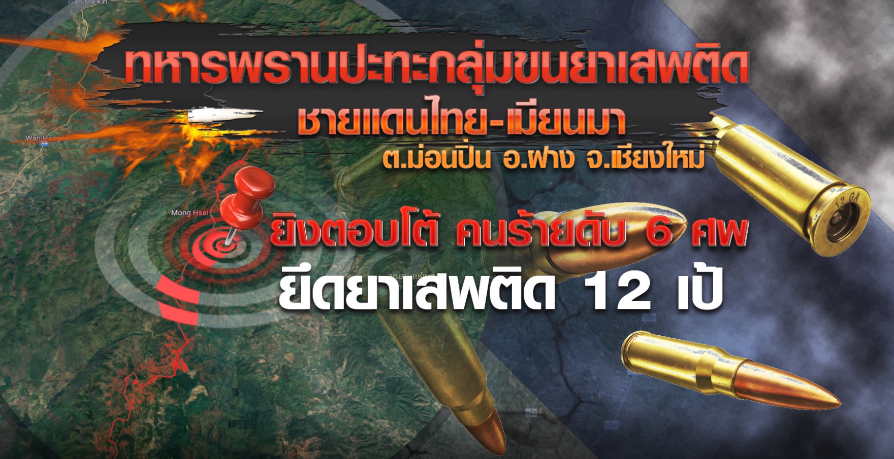 เชียงใหม่ 9 ม.ค.-ทหารพราน ปะทะคาราวานขนยาเสพติด ชายแดนไทย-เมียนมา พื้นที่ อ.ฝาง จ.เชียงใหม่ วิสามัญอย่างน้อย 6 ราย ยึดยาเสพติด 12 เป้