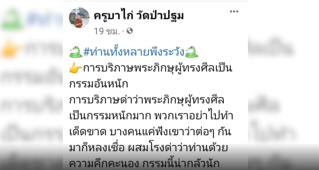 เฟซบุ๊กที่ชื่อ ครูบาไก่ วัดป่าปฐม ยังพบความเคลื่อนไหวการโพสต์ยาวเหยียด ทำนองว่า การบริภาษพระภิกษุผู้ทรงศีลเป็นกรรมหนัก ตายไปแล้วจะตกนรก โดยยกตัวอย่างวิบากกรรมในครั้งพุทธกาล และพระไตรปิฎกมาประกอบ
