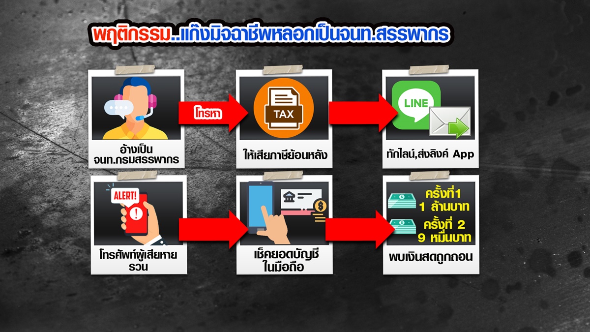 กระทั่งวันที่ 7 ธ.ค.65 มีโทรศัพท์ปลายทางเป็นเสียงผู้ชาย อ้างว่าเป็นเจ้าหน้าที่จากกรมสรรพากร บอกว่า ตอนที่ขายก๋วยเตี๋ยว ใช้แอปฯ “คนละครึ่ง” ทำให้ต้องเสียภาษีย้อนหลังเป็นจำนวนมาก หากไม่อยากเสียภาษี สามารถช่วยเหลือได้ จากนั้นก็มีการทักไลน์มาพูดคุย และส่งลิงก์เป็นแอปฯ ให้กดเข้าไปดู พร้อมพูดคุยสอบถามให้คำปรึกษาถึงแนวทางที่ไม่ต้องเสียภาษีย้อนหลัง ซึ่งตนไม่ได้ให้ข้อมูลเลขบัตรประชาชนและเลขบัญชีธนาคารแต่อย่างใด