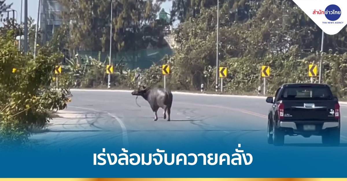 จากนั้นเจ้าหน้าที่นำกำลังไล่ติดตามควาย ซึ่งพยายามวิ่งหนีไปบนถนนบ้านป่ายางมน มุ่งหน้าไปยังแยกสนามกีฬา และขณะวิ่งหนีก็พยายามไล่ขวิดรถที่ขับผ่าน สุดท้ายควายเตลิดเข้าไปซ่อนในป่าริมถนน ทำให้ปศุสัตว์เร่งหาทางยิงยาสลบ แต่บริเวณที่ควายวิ่งเข้าไปมีพื้นที่กว้าง ทำให้หาตัวไม่เจอ ตอนนี้ต้องแจ้งเตือนชาวบ้านที่อยู่ละแวกใกล้เคียงระมัดระวัง หากพบเห็นให้รีบแจ้ง 191 ทันที.-สำนักข่าวไทย