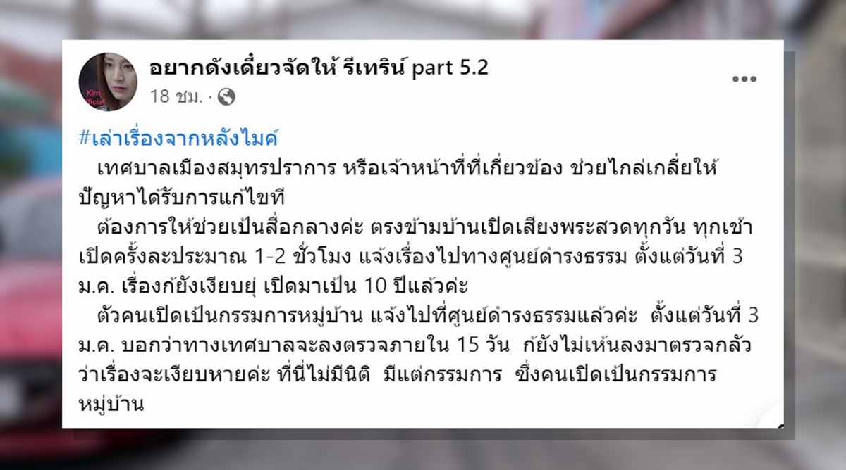 จากกรณีเพจอยากดังเดี๋ยวจัดให้ รีเทิร์น part 5.2 โพสต์คลิปจากกล้องวงจรปิด พร้อมระบุข้อความว่า “เทศบาลเมืองสมุทรปราการ หรือเจ้าหน้าที่ที่เกี่ยวข้อง ช่วยไกล่เกลี่ยให้ปัญหาได้รับการแก้ไขที ต้องการให้ช่วยเป็นสื่อกลางค่ะ ตรงข้ามบ้านเปิดเสียงพระสวดทุกวัน ทุกเช้า เปิดครั้งละประมาณ 1-2 ชั่วโมง แจ้งเรื่องไปทางศูนย์ดำรงธรรม ตั้งแต่วันที่ 3 ม.ค. เรื่องก็ยังเงียบอยู่ เปิดมาเป็น 10 ปีแล้วค่ะ ตัวคนเปิดเป็นกรรมการหมู่บ้าน แจ้งไปที่ศูนย์ดำรงธรรมแล้วค่ะ บอกว่าทางเทศบาลจะลงตรวจภายใน 15 วัน ก็ยังไม่เห็นลงมาตรวจ กลัวว่าเรื่องจะเงียบหายค่ะ ที่นี่ไม่มีนิติ มีแต่กรรมการ ซึ่งคนเปิดเป็นกรรมการหมู่บ้าน” โดยหลังจากคลิปนี้ถูกเผยแพร่ออกไป ก็มีคนเข้ามาแสดงความคิดเห็นกันเป็นจำนวนมาก
