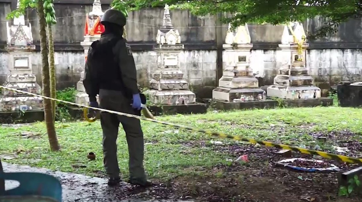 จากการตรวจสอบกล้องวงจรปิดบริเวณถนนสายต่างๆ ที่มุ่งหน้าไปยังจุดเกิดเหตุ เบื้องต้นพบกล้องวงจรปิดของบริษัทเอกชนแห่งหนึ่ง ซึ่งอยู่ข้างกำแพงรั้วของวัด บันทึกภาพคนร้ายเอาไว้ได้ ในช่วงเวลาเกิดเหตุมีฝนตก พบภาพชายต้องสงสัย 1 คน ใส่เสื้อคลุมสีขาวแขนยาวแบบมีฮู้ด สวมผ้าโสร่ง และใส่รองเท้าบู๊ท เดินออกมาจากมุมมืด ไปที่บริเวณข้างกำแพงวัด และขว้างระเบิดแสวงเครื่องแบบไปป์บอมบ์เข้าไปในวัด ตกที่บริเวณเมรุ เสียงระเบิดดังสนั่น ก่อนที่คนร้ายจะรีบวิ่งหลบหนีไป