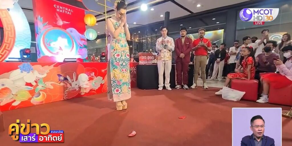 สงขลา 22 ม.ค. – ที่เดียวในโลก! การประกวด Miss Hatyai Chinese 2023 ให้องค์เทพเจ้าช่วยตัดสิน โดยใช้วิธีเสี่ยงทายโยนปัวะโป้ย หรือแท่งไม้ประกบคู่ ในรอบ 5 คนสุดท้าย สาวงามที่ได้ครองตำแหน่งนอกจากจะมีความสวยแล้ว ต้องมีโชควาสด้วย