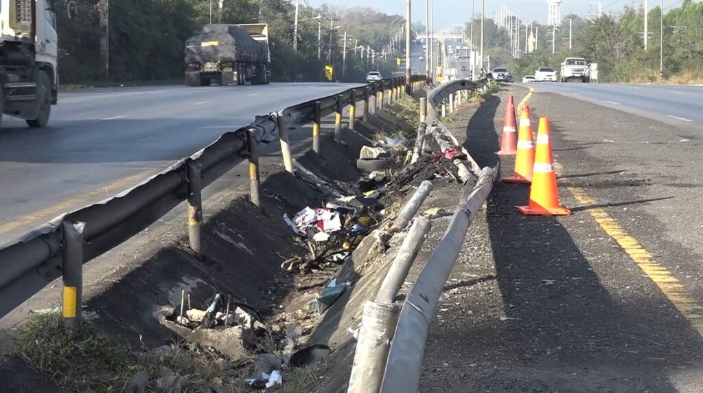 หลังเกิดเหตุผู้สื่อข่าวลงพื้นที่จุดเกิดเหตุ สภาพราวเหล็กกั้นทางถูกชนพังเสียหายยาวกว่า 10 เมตร ใกล้จุดกลับรถเป็นเนินลาดชัน ป้ายบอกทางพังราบ มีร่องรอยไฟไหม้ เสื้อผ้าข้าวของยังกองอยู่ในร่องเกาะกลางถนน และมีเจ้าหน้าที่เข้าทำความสะอาด เก็บกวาดถนน
