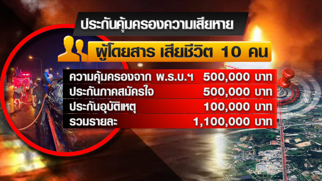 เมื่อดูรายละเอียดการคุ้มครองความเสียหายจากอุบัติเหตุครั้งนี้ พบว่าคุ้มครองผู้โดยสารที่เสียชีวิต 10 ราย ได้รับความคุ้มครองจาก พ.ร.บ. 500,000 บาท จากประกันภาคสมัครใจ 500,000 บาท และประกันอุบัติเหตุ 100,000 บาท รวมค่าชดเชยรายละ 1,100,000 บาท ส่วนกรณีคนขับรถได้ความคุ้มครองแค่ค่าปลงศพจาก พ.ร.บ. 35,000 บาท และประกันอุบัติเหตุอีก 100,000 บาท รวม 135,000 บาท อยู่ระหว่างประสานงานกับบริษัทประกันภัย เพื่อดูแลค่าชดเชยเยียวยาความเสียหายที่เกิดขึ้น