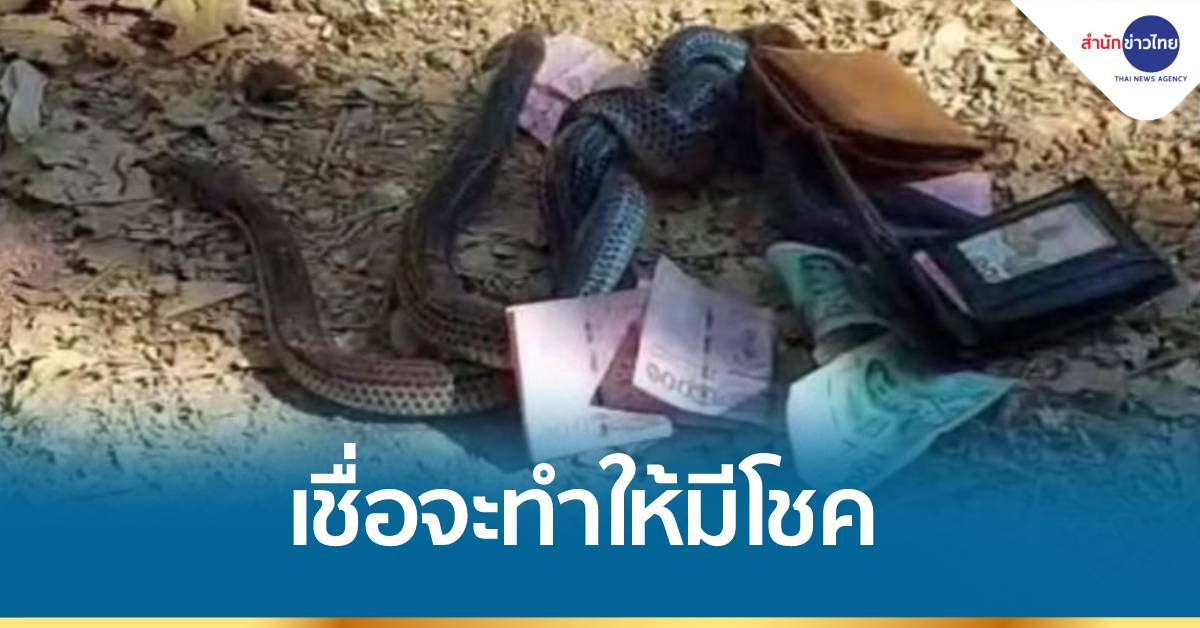 วันนี้ช่วงสายขณะที่กลุ่มกำนันตำบลนาอ้อ ผู้นำชุมชน ส.อบจ.เลย และเจ้าหน้าที่ อบจ.เลย เดินทางไปสำรวจการขุดลอกลำห้วยดั่ง พื้นที่รอยต่อระหว่างบ้านหนองมะผาง ตำบลนาอ้อกับบ้านน้ำภูตำบลเมือง อ.เมืองเลย พบงูแสงอาทิตย์กำลังเกี้ยวพาราสี กอดรัดกันกลางถนน จึงพากันจอดรถดูนานประมาณเกือบ 10 นาที จึงนำกระเป๋าสตางค์ของแต่คนโยนเข้าไปที่ตัวงู เพราะมีความเชื่อว่าจะทำให้มีโชคลาภ หลังจากนั้นงูก็ได้เลื้อยหนีแยกย้ายกันเข้าป่าไป