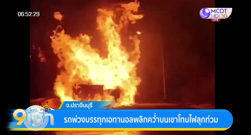 ปราจีนบุรี 25 ม.ค. – รถพ่วง 18 ล้อ บรรทุกเอทานอล ลงเขาเสียหลักพลิกคว่ำไฟลุกท่วมหวิดคลอกคนขับ หน้าศาลปู่โทน อ.นาดี จ.ปราจีนบุรี รถติดยาวหลาย กม.