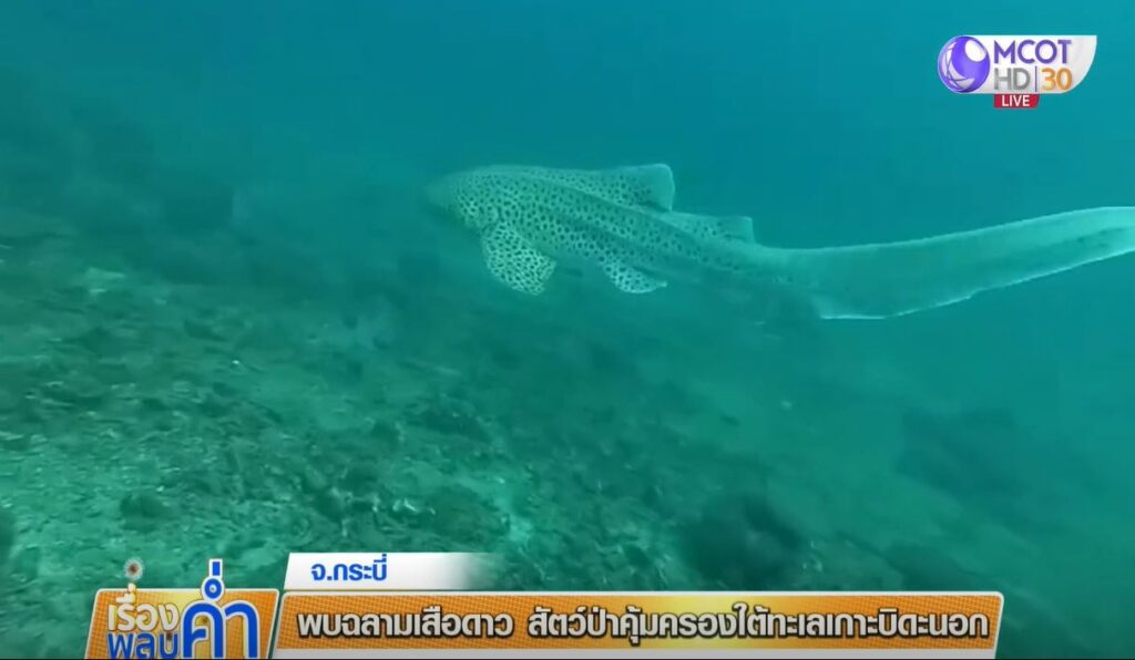 เจ้าหน้าที่อุทยานแห่งชาติหาดนพรัตน์ธารา – หมู่เกาะพีพี จ.กระบี่ บันทึกภาพขณะฉลามเสือดาวตัวขนาดใหญ่กำลังนอนทอดตัวยาวใต้ท้องทะเลอย่างสบายใจ บริเวณเกาะบิดะนอก ต.อ่าวนาง อ.เมืองกระบี่ สร้างความตื่นเต้นแก่ทีมสำรวจและนักท่องเที่ยวที่ดำน้ำชมธรรมชาติบริเวณดังกล่าวเป็นอย่างมาก เนื่องจากเป็นสัตว์ทะเลที่หาดูยาก เมื่อเจ้าหน้าที่เข้าไปถ่ายภาพใกล้ ๆ ไม่มีทีท่าตื่นกลัว ทำให้สามารถถ่ายภาพเก็บความน่ารักและความสวยงามของปลาฉลามเสือดาวได้อย่างใกล้ชิด