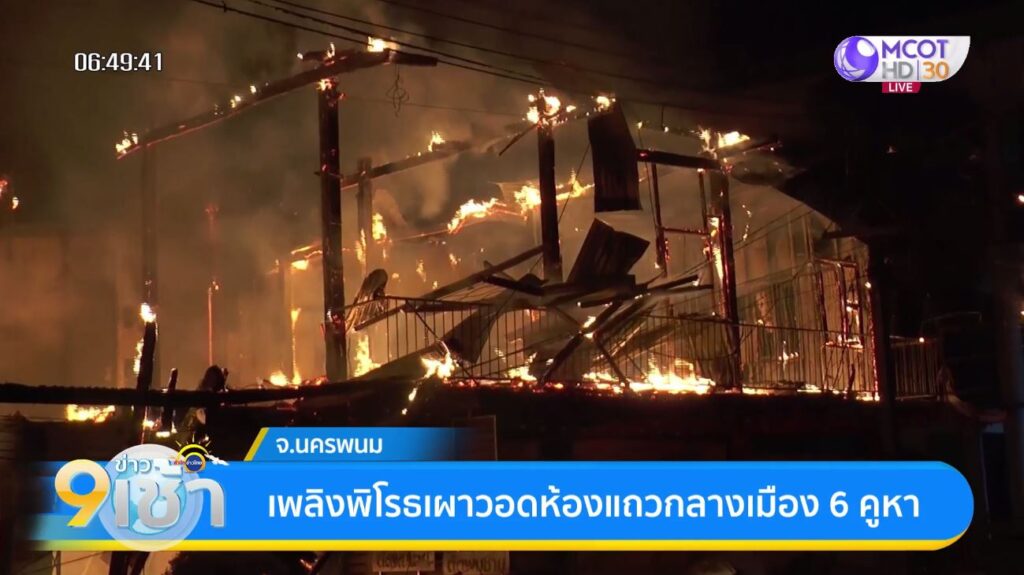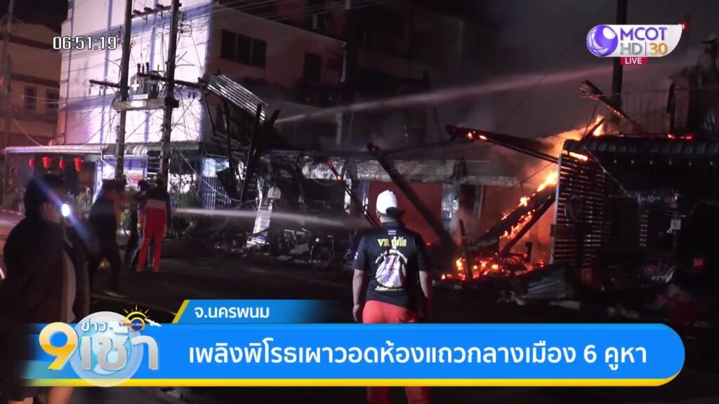 นครพนม 27 ม.ค. – ระทึก ! ไฟไหม้ห้องแถวไม้เก่ากลางเมืองนครพนม เสียหาย 6 คูหา เพื่อนบ้านอุ้มยาย วัย 86 ปี หนีตายจากบ้านต้นเพลิง ใช้เวลาควบคุมเพลิงนานกว่าชั่วโมง