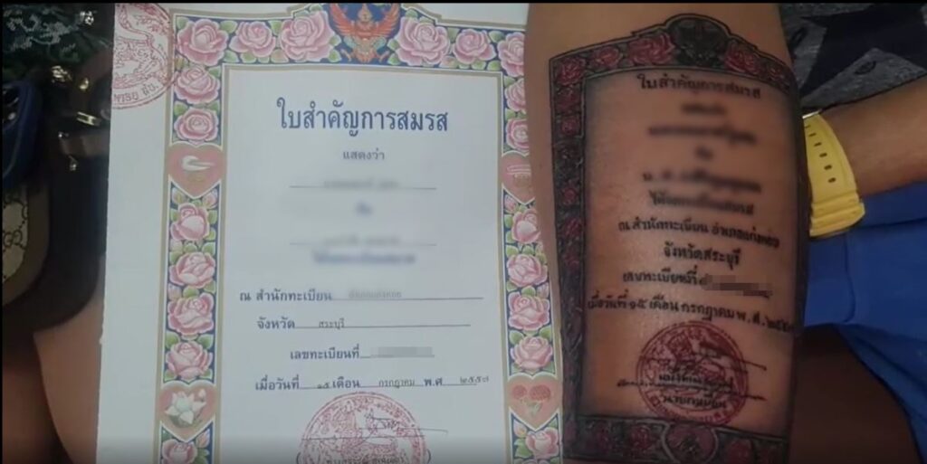 ผู้สื่อข่าวลงพื้นที่ไปยังร้านสักแก่งคอย สระบุรี พบกับนายเจนณรงค์ หรือบอล วุ่นคง อายุ 34 ปี เจ้าของแขนลายสักใบทะเบียนสมรส พร้อมด้วยนางสาวรำพึง หรือจอย คูณขุนทด อายุ 45 ปี พร้อมโชว์รอยสักรูปใบทะเบียนสมรสบนท่อนแขนขวาอย่างภาคภูมิใจ ทั้งคู่แต่งงานอยู่กินกันมา 8 ปีแล้ว จดทะเบียนสมรสเมื่อวันที่ 15 กรกฎาคม 2557 มีลูกชายด้วยกัน 1 คน วัย 7 ขวบ