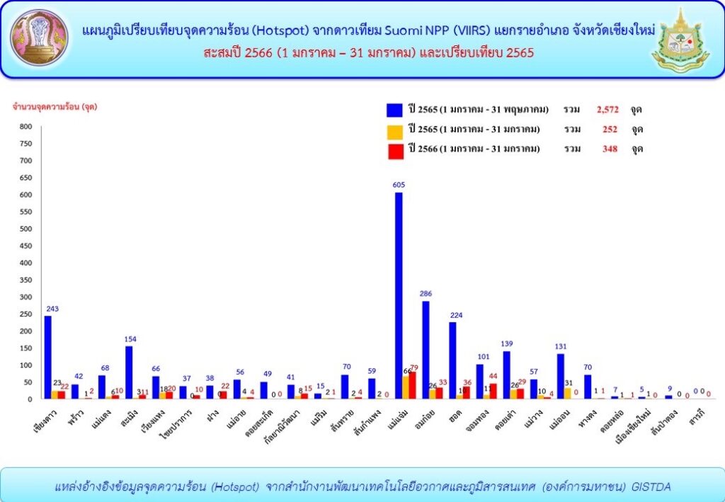 นางสาวปิยนุช ทรวงคำ นักวิชาการสิ่งแวดล้อมชำนาญการสำนักงานสิ่งแวดล้อมและควบคุมมลพิษที่ 1 แถลงถึงสถานการณ์ค่าคุณภาพอากาศ หรือ PM2.5 ในจังหวัดเชียงใหม่ ว่าปีนี้ต้องเฝ้าระวังมากกว่าปีที่ผ่านมา เนื่องจากปีที่แล้วได้ฝนมาช่วยชะล้าง ทำให้มีจุดความร้อนหรือฮอตสปอตอยู่ที่ 252 จุด ส่วนปีนี้พบมีจุดฮอตสปอตมากถึง 348 จุด โดยตอนนี้ในพื้นที่โซนใต้จะพบจุดความร้อนมากที่สุด ที่ อ.ฮอด, จอมทอง, แม่แจ่ม และเมื่อเกิดความแห้งแล้งจะเสี่ยงเกิดไฟป่า โดยในเดือนมีนาคมจะรุนแรงมากขึ้นเพราะยังมีเชื้อเพลิงอยู่จำนวนมาก