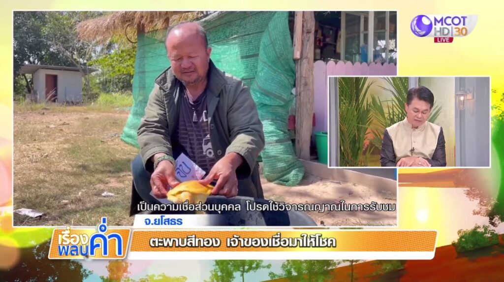 ยโสธร 31 ม.ค.- ชาวบ้านไปวางลอบดักปลาในลำน้ำจับตะพาบสีทองได้ 1 ตัว นำมาขายให้ร้านอาหารตามสั่ง เจ้าของร้านเลยเลี้ยงไว้ หลังจากได้มาก็รู้สึกว่ามีแต่สิ่งดีๆ เข้ามาในครอบครัว เคยมีคนมาเสนอขอซื้อในราคา 30,000 บาท แต่ไม่ขาย เพราะเชื่อว่ามาให้โชคให้ลาภ