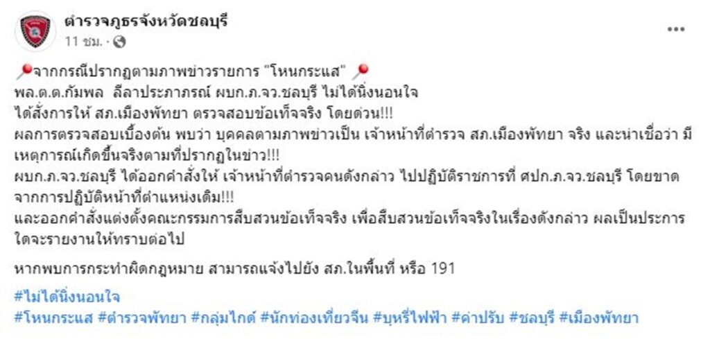 ผู้สื่อข่าวสอบถามไปยัง พ.ต.อ.กุลชาต กุลชัย ผู้กำกับการ สภ.เมืองพัทยา ทราบว่า เบื้องต้นทางดาบตำรวจคนดังกล่าว ยอมรับว่าเป็นบุคคลในภาพ แต่ปฏิเสธการเรียกรับผลประโยชน์ เบื้องต้นทาง สภ.เมืองพัทยา มีคำสั่งให้หยุดปฏิบัติหน้าที่งานจราจร และให้ไปช่วยงานธุรการ พร้อมตั้งคณะกรรมการตรวจสอบข้อเท็จจริง ก่อนที่ทางผู้บังคับการตำรวจภูธรจังหวัดชลบุรี จะมีคำสั่งย้ายมาช่วยราชการที่ศูนย์ปฏิบัติการตํารวจภูธรจังหวัดชลบุรี. – สำนักข่าวไทย