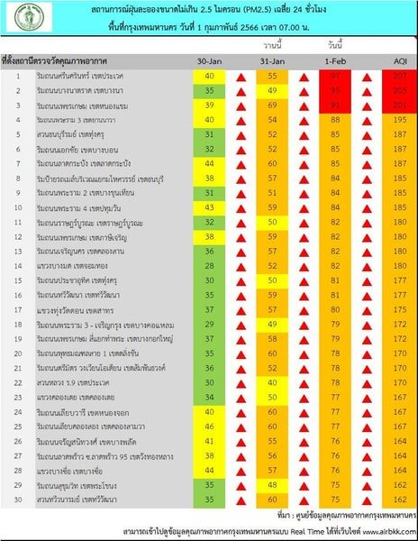 ขณะที่ กองจัดการคุณภาพอากาศและเสียง กรมควบคุมมลพิษรายงานคุณภาพอากาศพื้นที่กรุงเทพฯ และปริมณฑล เช้านี้สภาพอากาศนิ่งและปิด ทำให้ค่าฝุ่น PM2.5 พื้นที่ 3 เขต อยู่ในเกณฑ์สีแดง มีผลกระทบต่อสุขภาพ คือ เขตประเวศ บางนา และหนองแขม ค่าฝุ่นมากกว่า 90 ไมโครกรัมต่อลูกบาศก์เมตร นอกจากนี้ ยังมีอีก 19 เขต อยู่ในเกณฑ์สีส้ม เริ่มส่งผลกระทบต่อสุขภาพ แนะประชาชนหลีกเลี่ยงกิจกรรมกลางแจ้ง ใช้หน้ากากป้องกันฝุ่น PM2.5 และหากมีอาการทางสุขภาพควรปรึกษาแพทย์ .-สำนักข่าวไทย
