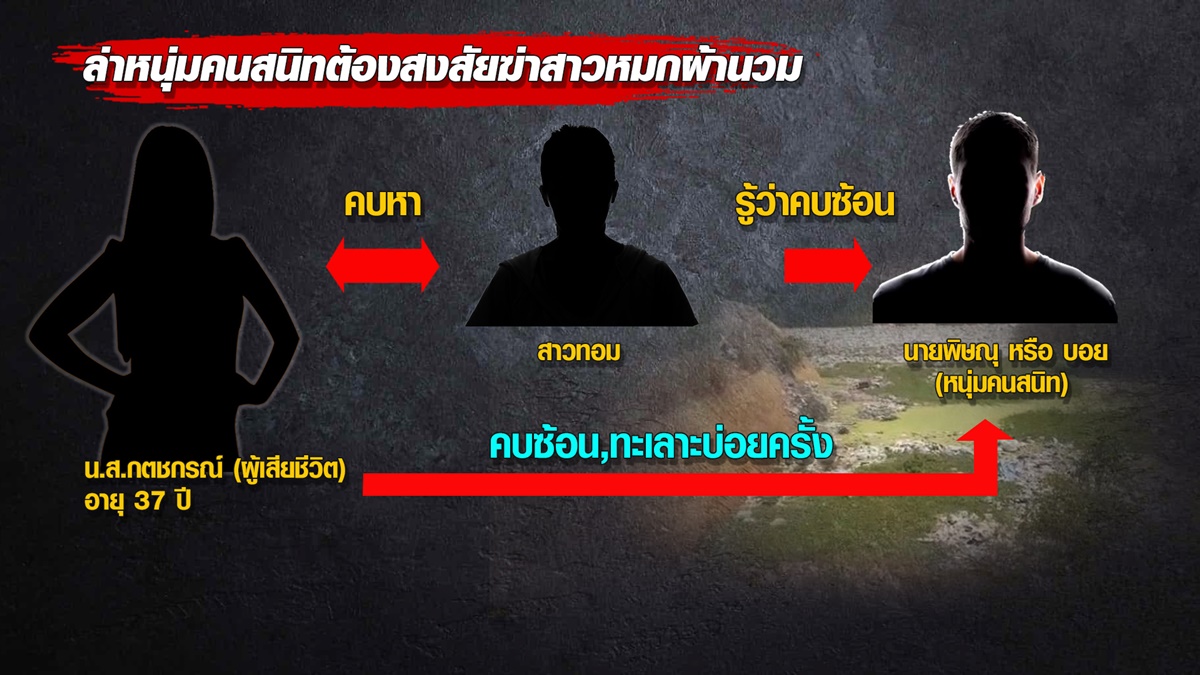 จากนั้นตำรวจสอบสวนจนทราบว่า ผู้เสียชีวิต คือ น.ส.กตชกรณ์ อายุ 37 ปี มีแฟนเป็นสาวทอม คบหากันมานาน แต่ปรากฏว่า ผู้ตายแอบไปมีสัมพันธ์กับนายพิษณุ หรือ บอย จนกลายเป็นเหตุคบซ้อน แต่แฟนสาวทอมไม่ได้ว่าอะไร ก็ยังคงคบหากันตามปกติ แต่เป็นนายบอย ที่เกิดความหึงหวง เกรงว่าผู้ตายจะปันใจ และตีตัวออกห่าง จนทะเลาะกันบ่อยครั้ง กระทั่งวันที่ 26 ม.ค.66 นายบอย มารับผู้ตายแล้วหายไป ไม่สามารถติดต่อได้ จนมีผู้พบศพถูกมัดมือมัดเท้าห่อด้วยผ้านวมในบ่อขยะ