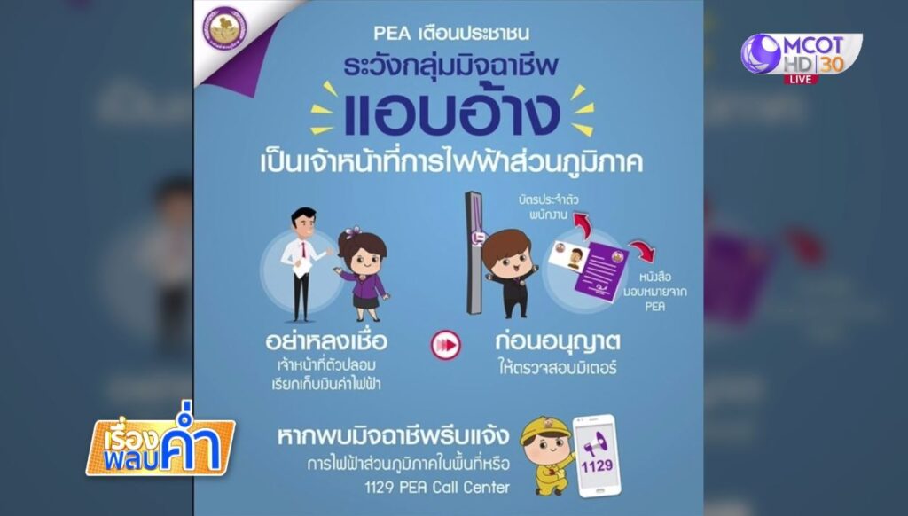 ขอนแก่น 3 ก.พ. – การไฟฟ้าส่วนภูมิภาคจังหวัดขอนแก่น จ่อแจ้งความมิจฉาชีพอ้างเป็นเจ้าหน้าที่การไฟฟ้า หลอกเหยื่อให้เปลี่ยนอุปกรณ์ไฟฟ้า และอ้างรู้จักรองผู้ว่าการไฟฟ้าส่วนภูมิภาค สามารถฝากคนเข้าทำงาน มีคนหลงเชื่อหลายราย สูญเงินนับล้านบาท ย้ำ กฟภ. ไม่มีนโยบายเรียกเก็บเงินค่าบริการติดตั้งระบบไฟฟ้านอกสถานที่ ผู้ใช้ไฟฟ้าต้องมาติดต่อเองที่สำนักงานเท่านั้น