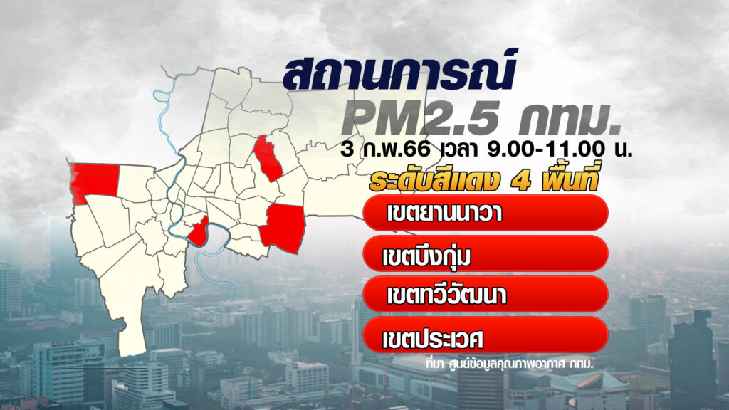 3 ก.พ. – ยังคงเป็นปัญหาต่อเนื่อง สำหรับสถานการณ์ฝุ่น PM2.5 แม้วันนี้คุณภาพอากาศใน กทม. จะดีขึ้นเล็กน้อย แต่ปริมาณฝุ่นยังเกินค่ามาตรฐาน เช่นเดียวกับอีกหลายจังหวัด