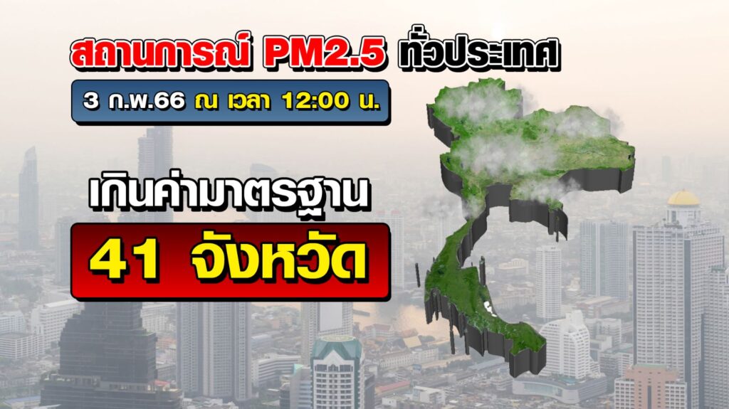 ส่วนสถานการณ์ทั่วประเทศ ศูนย์แก้ไขปัญหามลพิษทางอากาศ รายงานปริมาณ PM2.5 วันนี้ (3 ก.พ.) ณ เวลา 12.00 น. ในประเทศพบเกินค่ามาตรฐานใน 41 จังหวัด ภาคเหนือเกินค่ามาตรฐานเป็นส่วนใหญ่ ตรวจวัดได้ 32-154 มคก./ลบ.ม., ภาคตะวันออกเฉียงเหนือเกินค่ามาตรฐาน 6 พื้นที่ ตรวจวัดได้ 23-92 มคก./ลบ.ม. ภาคกลางและตะวันตก เกินค่ามาตรฐานเป็นส่วนใหญ่ ตรวจวัดได้ 47-115 มคก./ลบ.ม. ภาคตะวันออก เกินค่ามาตรฐาน 3 พื้นที่ ตรวจวัดได้ 27-65 มคก./ลบ.ม. มีเพียงภาคใต้ ภาพรวมอยู่ในเกณฑ์ดีมาก ตรวจวัดได้ 9-27 มคก./ลบ.ม.