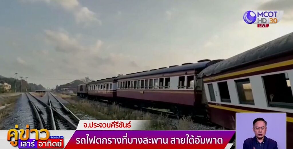 บางสะพาน 4 ก.พ. – เจ้าหน้าที่การรถไฟฯ เร่งกู้รถไฟขบวนที่ 986 วิ่งส่งพัสดุด่วนจากสุไหงโก-ลก ตกรางก่อนถึงสถานีอำเภอบางสะพาน