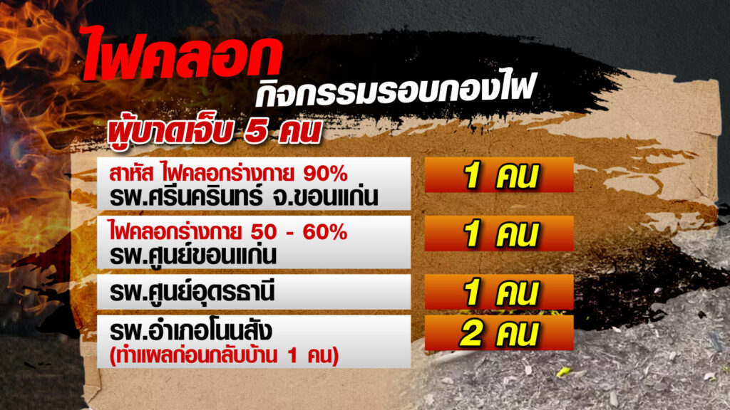 โดยบุตรชายของผู้แจ้งได้รับบาดเจ็บถูกไฟไหม้ตามร่างกาย ประมาณ 50-60 เปอร์เซ็นต์ ส่งรักษาตัวที่โรงพยาบาลศูนย์ขอนแก่น ส่วนเด็กชายที่ ถูกไฟไหม้ตามร่างกาย ประมาณ 90 เปอร์เซ็นต์ ส่งไปรักษาตัวที่โรงพยาบาลศรีนครินทร์ขอนแก่น จึงมาแจ้งความร้องทุกข์ให้สืบสวนหาสาเหตุและสืบสวนหาตัวผู้กระทำผิดต่อไป