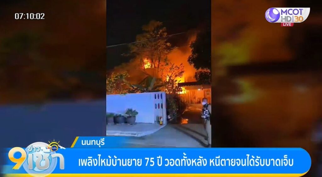 นนทบุรี 6 ก.พ. – ไฟไหม้บ้านเสียหายทั้งหลัง ยายวัย 75 ปี ปีนออกจากบ้านหนีตายได้รับบาดเจ็บ ถูกไฟลวกขา เบื้องต้นตำรวจประสานเจ้าหน้าที่พิสูจน์หลักฐานตรวจสอบเพื่อหาสาเหตุเพลิงไหม้