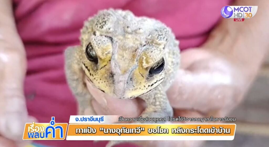 บ้านหลังหนึ่งใน ต.ย่านรี อ.กบินทร์บุรี จ.ปราจีนบุรี ของคุณลุงทองพูน อายุ 63 ปี ชาวบ้านกำลังมุงดูคางคกสีทอง หรือที่ชาวบ้านเรียกว่า “นางอุทัยเทวีสีทอง” บริเวณปากและดวงตามีสีทองเหลืองอร่าม ตามลำตัวยังมีสีทองเป็นจุดกระจายอยู่ทั่ว แต่กลับมีเล็บสีดำแปลกจากคางคกทั่วไป