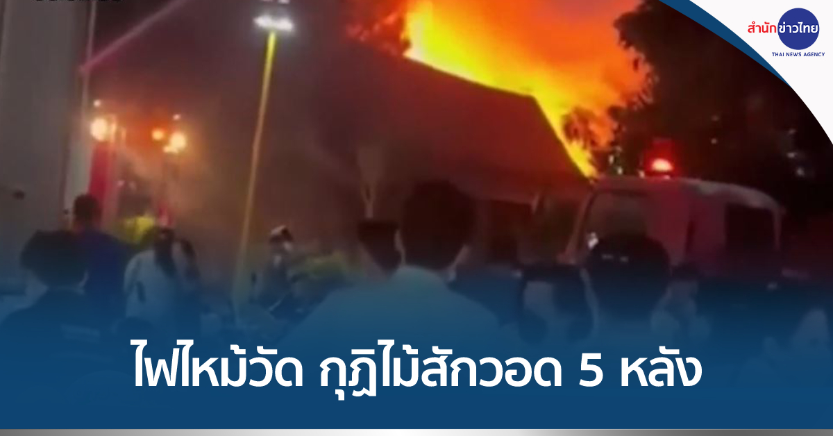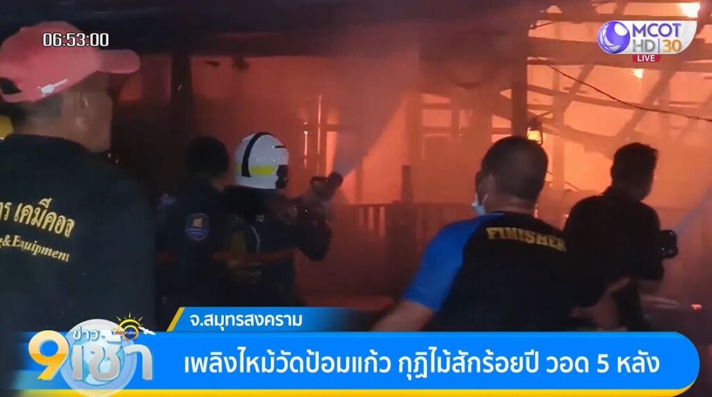 สมุทรสงคราม 7 ก.พ. – ไฟไหม้วัดป้อมแก้ว ใกล้ตลาดร่มหุบ จ.สมุทรสงคราม กุฏิไม้สักอายุเกือบ 100 ปี วอดทั้ง 5 หลัง มูลค่าความเสียหายไม่ต่ำกว่า 15 ล้านบาท สาเหตุเบื้องต้นคาดเกิดจากไฟฟ้าลัดวงจร
