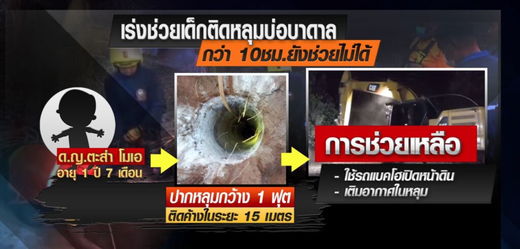 ย้อนไทม์ไลน์นาทีบีบหัวใจที่พ่อแม่ต่างรอคอยด้วยความหวังว่าจะหาลูกเจอหรือไม่ พ่อกับแม่เล่าว่า ตอนเกิดเหตุกำลังทำงานรับจ้างขุดมันสำปะหลังอยู่ ทำให้คลาดสายตา ไม่ได้มองลูก แต่เมื่อหันไปหา ลูกหายตัวไปอย่างไร้ร่องรอย พ่อแม่และเพื่อนคนงานพยายามช่วยกันค้นหา สุดท้ายสงสัยว่าลูกอาจพลัดตกลงไปในหลุมบ่อบาดาลลึก 15 เมตร และอยู่ใกล้กับจุดที่พ่อแม่ทำงานอยู่ ลองตะโกนลงไปในหลุม ได้ยินเสียงลูกร้องไห้ จึงรีบแจ้งเจ้าหน้าที่ให้มาช่วยเหลือ