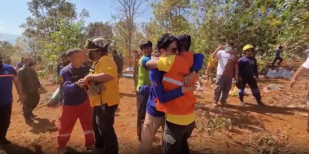 ขณะที่กู้ภัยที่เข้าให้การช่วยเหลือเด็กอย่างไม่ละความพยายาม ต่างดีใจโห่ร้อง โผกอดกันที่พยายามความสำเร็จไปด้วยดี