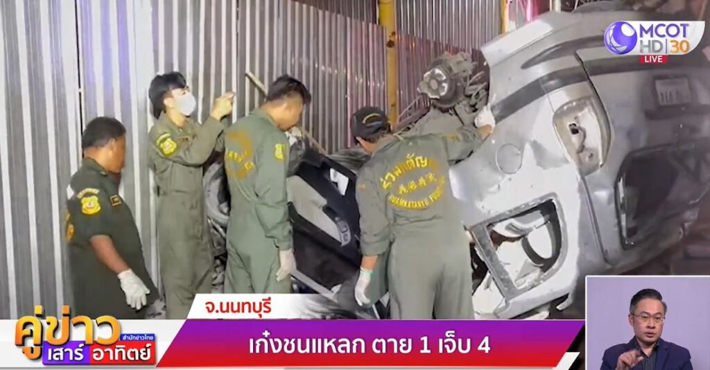 เหตุเกิดเมื่อเวลา 00.30 น.ที่ผ่านมา บริเวณถนนชัยพฤกษ์ มุ่งหน้าบางบัวทอง ต.บางพลับ อ.ปากเกร็ด จ.นนทบุรี รถยนต์ 5 ประตู ยี่ห้อเชฟโรเลตสีบรอนซ์เงิน อยู่ในสภาพพังยับทั้งคัน พบนายยุทธภูมิ อายุ 29 ปี เสียชีวิตติดอยู่บริเวณเบาะคนขับ และมีผู้บาดเจ็บ 4 คน ใกล้กันพบรถกระบะโตโยต้าสีดำ สภาพด้านหน้ารถพังยับ