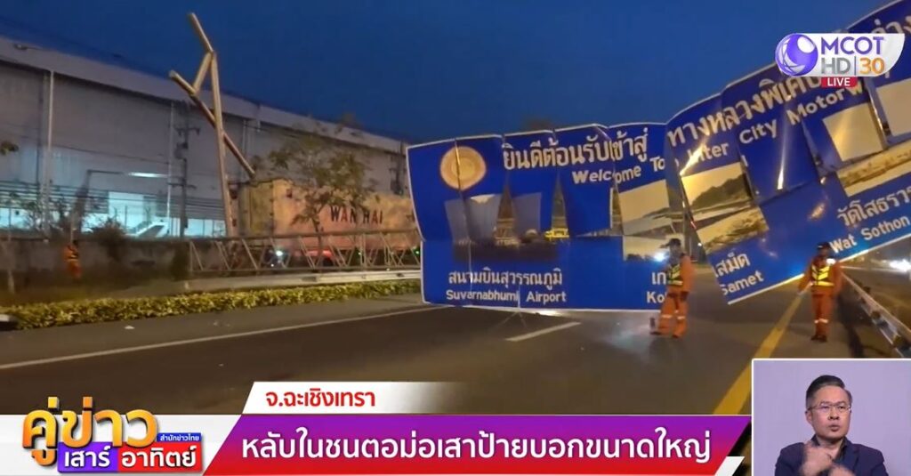 ส่วนที่ จ.ฉะเชิงเทรา รถพ่วง 22 ล้อ เสียหลักตกข้างทางชนตอม่อเสาป้ายบอกทางขนาดใหญ่ บริเวณถนนเทพรัตน (บางนา-ตราด) กม.39 ต.บางวัว อ.บางปะกง จนขาด ทำให้ป้ายหล่นขวางถนนทุกช่องทาง