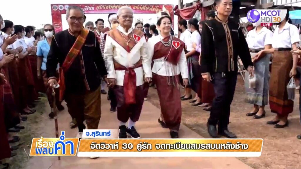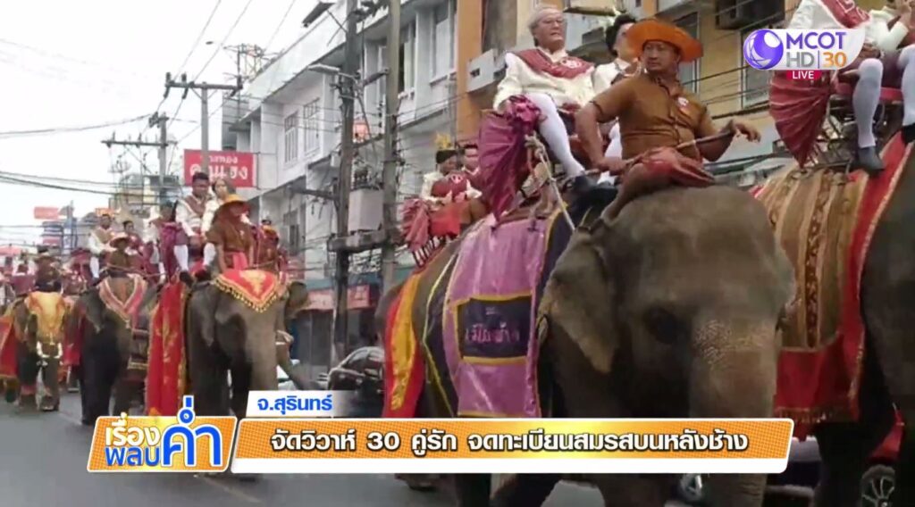 ภูมิภาค 14 ก.พ. – ที่เมืองช้าง จ.สุรินทร์ ได้จัดงานวิวาห์หวานวันวาเลนไทน์ 30 คู่รักจดทะเบียนสมรสบนหลังช้าง มีนักท่องเที่ยวทั้งชาวไทยและชาวต่างชาติ ร่วมกันอวยพรให้คู่บ่าวสาวทั้ง 30 คู่ ที่มาร่วมแต่งงานแบบกลุ่มชาติพันธุ์กูยโบราณของจังหวัดด้วย