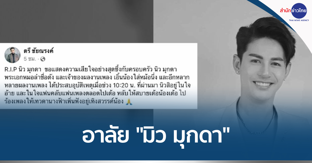 รวมทั้งนักร้องดัง “ตรี ชัยณรงค์” โพสต์แจ้งข่าวเศร้าว่า นิว มุกดา พระเอกหมอลำชื่อดัง เสียชีวิตแล้วจากอุบัติเหตุ โดยเขาให้รายละเอียดว่า “R.I.P นิว มุกดา ขอแสดงความเสียใจอย่างสุดซึ้งกับครอบครัว นิว มุกดา พระเอกหมอลำชื่อดัง และเจ้าของผลงานเพลง เอิ้นน้องใส่หม้อนึ่ง และอีกหลากหลายผลงานเพลง ได้ประสบอุบัติเหตุเมื่อช่วง 10.20 น.ที่ผ่านมา นิวสิอยู่ในใจอ้าย และในใจแฟนคลับแฟนเพลงตลอดไปเด้อ หลับให้สบายเด้อน้องเด้อ ไปร้องเพลงให้เทวดานางฟ้าเพิ่นฟังอยู่เทิงสวรรค์น้อง” .-สำนักข่าวไทย