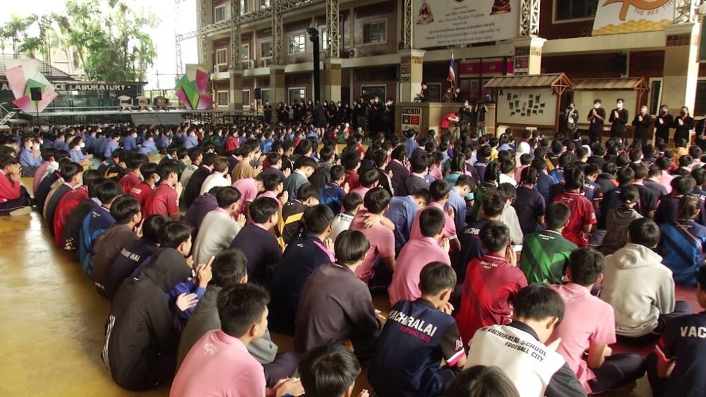 ที่โรงเรียนวชิราลัย อ.สารภี จ.เชียงใหม่ จัดงานไว้อาลัยให้กับนายดวงเพชร พรหมเทพ หรือ น้องดอม 1 ใน 13 สมาชิกทีมหมูป่าอะคาเดมี ที่ติดถ้ำหลวงขุนน้ำนางนอน จ.เชียงราย นักเรียนชั้นมัธยมปีที่ 5 ของโรงเรียน
