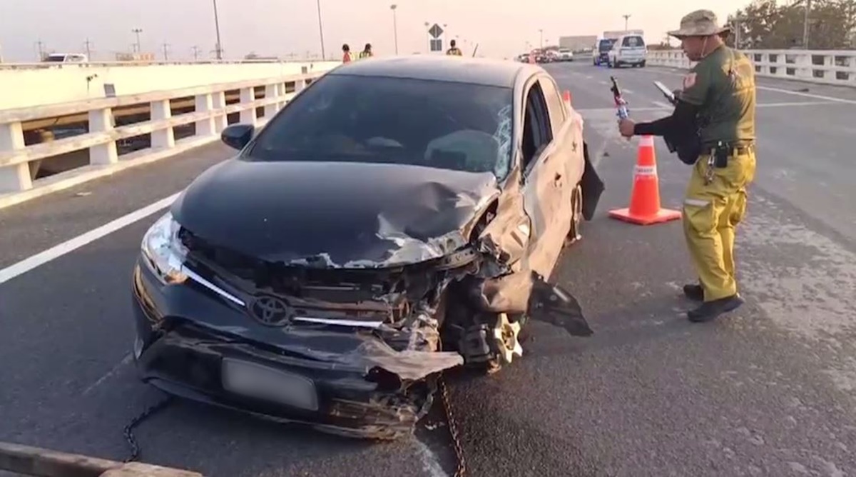 นอกจากนี้ยังพบรถเก๋งสีดำ ไม่ติดแผ่นป้ายทะเบียนด้านหลัง จอดอยู่ช่องทางเดินรถขวาสุด สภาพด้านหน้ารถฝั่งซ้ายมีร่องรอยการชนจนได้รับความเสียหายยับเยิน ล้อหน้าและล้อหลังฝั่งขวาแตก ภายในห้องโดยสารพบขวดเครื่องดื่มแอลกอฮอล์ตกอยู่ 1 ขวด ส่วนผู้ขับขี่หลังเกิดเหตุได้หลบหนีไป
