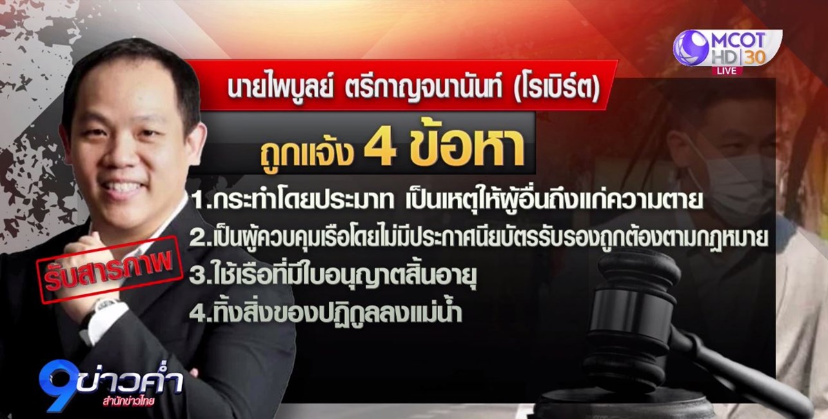 และจำเลยที่ 2 คือ โรเบิร์ต ในข้อหาผู้ฝ่าฝืนใช้เรือที่มิได้รับอนุญาตใช้เรือ หรือใช้เรือที่ใบอนุญาตใช้เรือสิ้นอายุแล้ว หรือใช้เรือผิดไปจากเขตหรือตำบลการเดินเรือที่กำหนดไว้ในใบอนุญาตใช้เรือ และการกระทำนั้นเป็นเหตุให้ผู้อื่นถึงแก่ความตาย