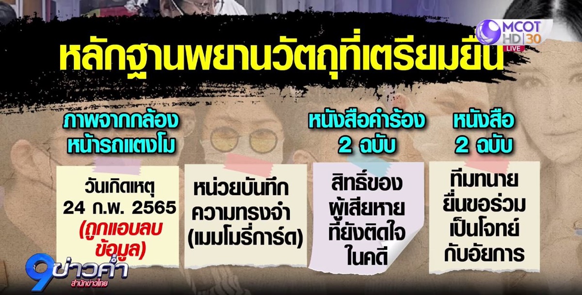 นอกจากนี้ “แม่แตงโม” ยังได้กล่าวถึงหลักฐานใหม่ที่ยื่นต่อศาล เพื่อขอเป็นโจทก์ร่วมในคดีวันนี้ว่า เป็นคลิปกล้องหน้ารถแตงโม ที่ได้ไปยื่นขอของกลางจากตำรวจที่มีการเก็บรักษาไว้กว่า 1 ปี และมีข้อมูลบางส่วนถูกลบไป โดยได้ให้ผู้เชี่ยวชาญทำการกู้ข้อมูลกลับมา พบว่าในรถมีการสนทนากันระหว่างคน 2 คน ถึงเรื่องราวและเหตุการณ์ที่เกิดขึ้น ซึ่งตัวแม่เองได้ฟังตั้งแต่ต้นจนจบ รู้สึกมั่นใจกับหลักฐานชิ้นนี้ และจำเสียงบุคคลในคลิปได้อย่างชัดเจน แต่ขอให้เป็นรายละเอียดในสำนวน