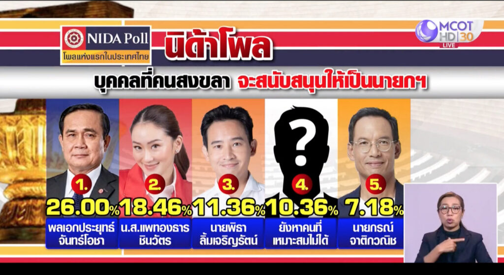 จากการสำรวจเมื่อถามถึงบุคคลที่คนสงขลาจะสนับสนุนให้เป็นนายกรัฐมนตรีในวันนี้ พบว่า อันดับ 1 ร้อยละ 26.00 ระบุว่าเป็น พลเอกประยุทธ์ จันทร์โอชา (พรรครวมไทยสร้างชาติ) เพราะ ซื่อสัตย์สุจริต มีความเด็ดขาด กล้าตัดสินใจ ทำให้บ้านเมืองเกิดความสงบและต้องการให้บริหารประเทศอย่างต่อเนื่อง อันดับ 2 ร้อยละ 18.46 ระบุว่าเป็น น.ส.แพทองธาร (อุ๊งอิ๊งค์) ชินวัตร (พรรคเพื่อไทย) เพราะเป็นคนรุ่นใหม่ ชื่นชอบพรรคเพื่อไทย นโยบายของพรรคเพื่อไทยสามารถแก้ไขปัญหาราคาสินค้าทางการเกษตรได้ ขณะที่บางส่วนระบุว่า ชื่นชอบผลงานของตระกูลชินวัตร อันดับ 3 ร้อยละ 11.36 ระบุว่าเป็น นายพิธา ลิ้มเจริญรัตน์ (พรรคก้าวไกล) เพราะ ต้องการเปิดโอกาสให้คนรุ่นใหม่เข้ามาบริหารประเทศ เป็นคนมีวิสัยทัศน์ ชื่นชอบนโยบายและอุดมการณ์ทางการเมืองของพรรคก้าวไกล อันดับ 4 ร้อยละ 10.36 ระบุว่า ยังหาคนที่เหมาะสมไม่ได้ อันดับ 5 ร้อยละ 7.18 ระบุว่าเป็น นายกรณ์ จาติกวณิช (พรรคชาติพัฒนากล้า) เพราะ เป็นคนมีความรู้ความสามารถ มีความเชี่ยวชาญด้านเศรษฐกิจ และชื่นชอบนโยบายของพรรคชาติพัฒนากล้า อันดับ 6 ร้อยละ 6.73 ระบุว่าเป็น นายจุรินทร์ ลักษณวิศิษฏ์ (พรรคประชาธิปัตย์) เพราะ สนับสนุนพรรคประชาธิปัตย์ ชื่นชอบผลงานที่ผ่านมา ขณะที่บางส่วนระบุว่า เป็นคนใต้เหมือนกัน อันดับ 7 ร้อยละ 4.64 ระบุว่าเป็น นายอนุทิน ชาญวีรกูล (พรรคภูมิใจไทย) เพราะ มีผลงานชัดเจน มีประสบการณ์ด้านการบริหารประเทศและชื่นชอบนโยบายพรรคภูมิใจไทย อันดับ 8 ร้อยละ 4.18 ระบุว่าเป็น พล.ต.อ.เสรีพิศุทธ์ เตมียเวส (พรรคเสรีรวมไทย) เพราะ เป็นคนพูดจริงทำจริง ตรงไปตรงมา มีความซื่อสัตย์สุจริต และชื่นชอบวิธีการทำงาน อันดับ 9 ร้อยละ 3.18 ระบุว่าเป็น คุณหญิงสุดารัตน์ เกยุราพันธุ์ (พรรคไทยสร้างไทย) เพราะ ต้องการเปิดโอกาสให้ผู้หญิงเข้ามาบริหารประเทศ มีประสบการณ์ด้านการบริหาร และชื่นชอบนโยบายของพรรคไทยสร้างไทย อันดับ 10 ร้อยละ 1.91 ระบุว่า ไม่ตอบ/ไม่สนใจ อันดับ 11 ร้อยละ 1.27 ระบุว่าเป็น นายวันมูหะมัดนอร์ มะทา (พรรคประชาชาติ) เพราะ มีประสบการณ์ในการทำงาน และช่วยเหลือประชาชนอย่างต่อเนื่อง อันดับ 12 ร้อยละ 1.09 ระบุว่าเป็น พลเอกประวิตร วงษ์สุวรรณ (พรรคพลังประชารัฐ) เพราะ เป็นคนซื่อสัตย์สุจริต และตรงไปตรงมา และร้อยละ 3.64 ระบุอื่น ๆ ได้แก่ ดร.สมคิด จาตุศรีพิทักษ์ (พรรคสร้างอนาคตไทย) น.ส.กัญจนา ศิลปอาชา (พรรคชาติไทยพัฒนา) นพ. ชลน่าน ศรีแก้ว (พรรคเพื่อไทย) นพ.วรงค์ เดชกิจวิกรม (พรรคไทยภักดี) นายอภิสิทธิ์ เวชชาชีวะ (พรรคประชาธิปัตย์) นายมงคลกิตติ์ สุขสินธารานนท์ (พรรคไทยศรีวิไลย์) นายมิ่ง
