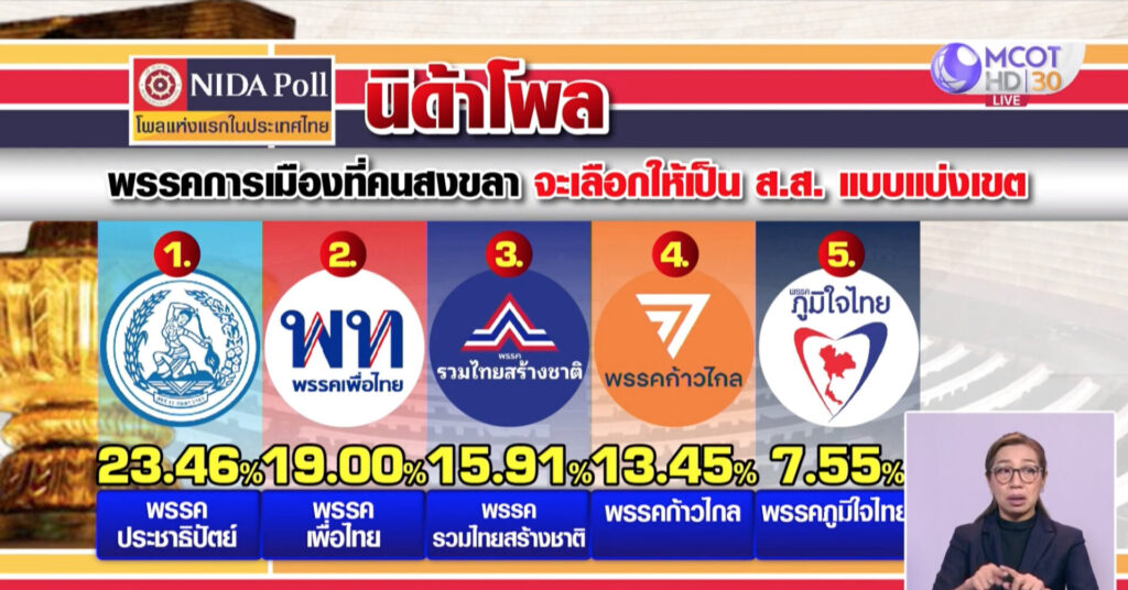สงขลา 5 มี.ค. – ผลสำรวจ นิด้าโพล คนสงขลาเลือกพรรคไหน ทำการสำรวจระหว่างวันที่ 17-23 กุมภาพันธ์ 2566 จากประชาชนที่มีอายุ 18 ปีขึ้นไป และมีสิทธิเลือกตั้งในจังหวัดสงขลา (อ่านฉบับเต็ม https://nidapoll.nida.ac.th/survey_detail?survey_id=618)