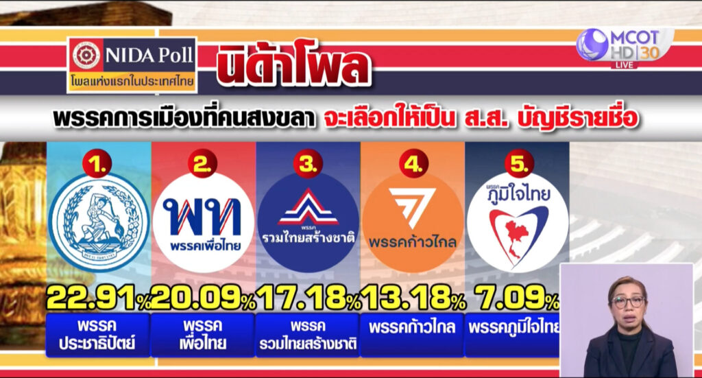 ด้านพรรคการเมืองที่คนสงขลามีแนวโน้มจะเลือกให้เป็น ส.ส. แบบบัญชีรายชื่อ ในวันนี้ พบว่า อันดับ 1 ร้อยละ 22.91 ระบุว่าเป็น พรรคประชาธิปัตย์ อันดับ 2 ร้อยละ 20.09 ระบุว่าเป็น พรรคเพื่อไทย อันดับ 3 ร้อยละ 17.18 ระบุว่าเป็น พรรครวมไทยสร้างชาติ อันดับ 4 ร้อยละ 13.18 ระบุว่าเป็น พรรคก้าวไกล อันดับ 5 ร้อยละ 7.09 ระบุว่าเป็น พรรคภูมิใจไทย อันดับ 6 ร้อยละ 5.18 ระบุว่าเป็น พรรคชาติพัฒนากล้า อันดับ 7 ร้อยละ 4.09 ระบุว่า ยังไม่ตัดสินใจ อันดับ 8 ร้อยละ 3.00 ระบุว่าเป็น พรรคเสรีรวมไทย อันดับ 9 ร้อยละ 2.46 ระบุว่าเป็นพรรคพลังประชารัฐ อันดับ 10 ร้อยละ 1.55 ระบุว่าเป็น พรรคไทยสร้างไทย และอันดับ 11 ร้อยละ 1.09 ระบุว่าเป็น พรรคกล้า พรรคประชาชาติ ในสัดส่วนที่เท่ากัน และอื่น ๆ ได้แก่ พรรคไทยภักดี พรรคชาติไทยพัฒนา พรรคสร้างอนาคตไทย พรรคไทยศรีวิไลย์ และไม่ตอบ/ไม่สนใจ