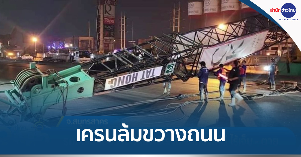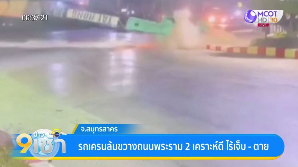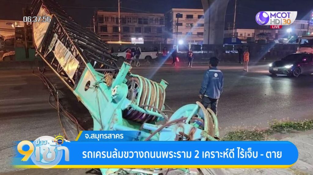 สมุทรสาคร 8 มี.ค. – นาทีระทึก รถเครนล้มขวางถนนพระราม 2 ใน อ.เมือง จ.สมุทรสาคร รถเบรกทัน ไร้เจ็บ – ตาย ต้องปิดจราจร 30 นาที เคลียร์พื้นที่