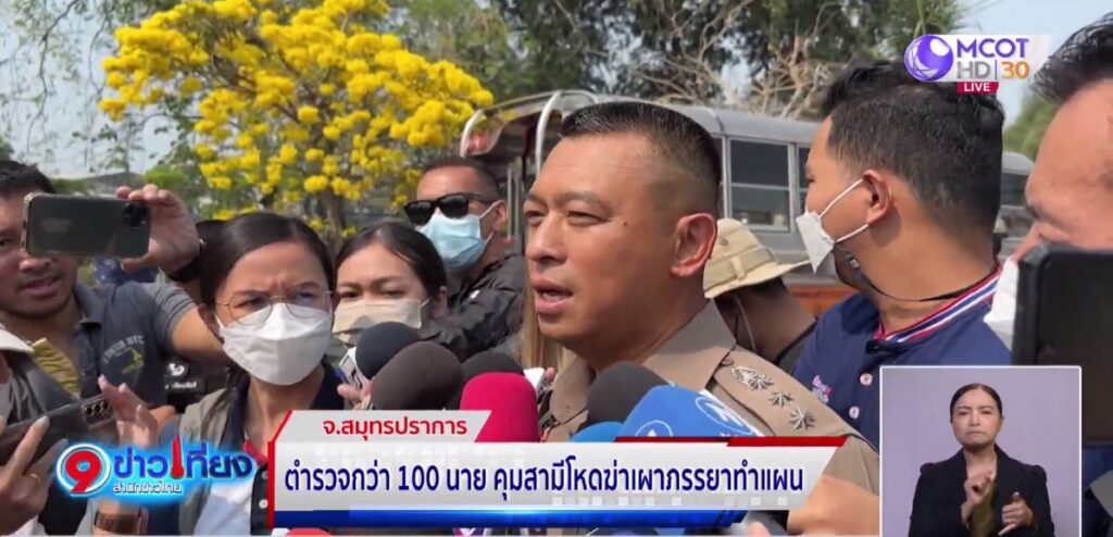 สมุทรปราการ 8 มี.ค. – ตำรวจกว่า 100 นาย คุมตัวผู้ต้องหาคดีฆ่าภรรยา ราดน้ำมันจุดไฟเผาแทงซ้ำ ไปทำแผนประกอบคำรับสารภาพ ที่จุดเกิดเหตุภายในนิคมฯ บางปู ซอย 9A อ.เมืองสมุทรปราการ ชาวบ้านที่มารอดูตะโกนสาปแช่ง ขณะที่ผู้ต้องหามีสีหน้าเรียบเฉย ตร.ตั้งข้อหาฆ่าผู้อื่นโดยเจตนาและไตร่ตรองไว้ก่อน