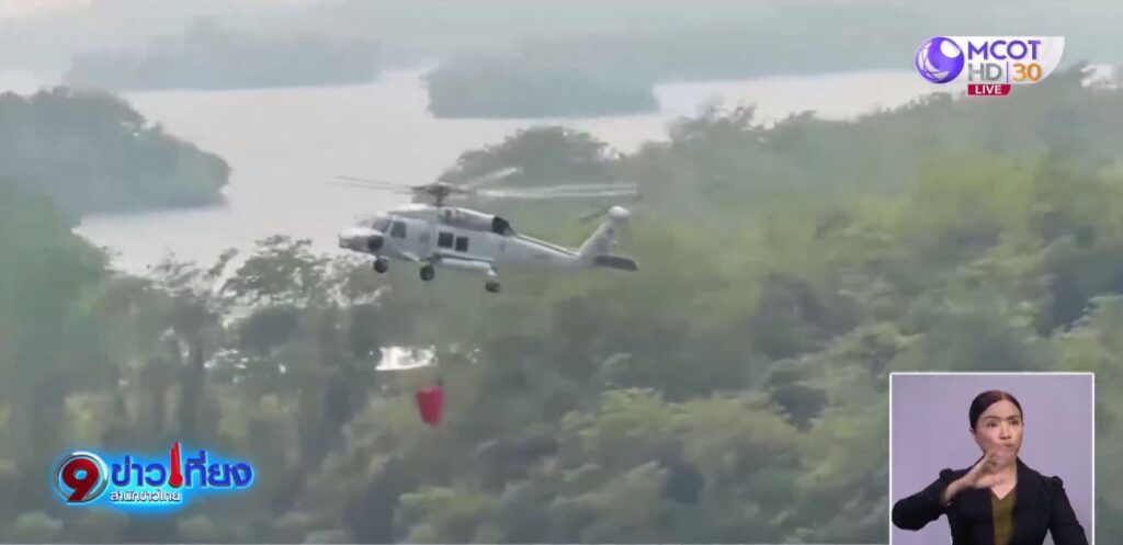 พล.ร.ต.เทอดเกียรติ จิตต์แก้ว รองผู้บัญชาการป้องกันชายแดนจันทบุรีและตราด กล่าวว่า เฮลิคอปเตอร์ของทหารเรือ ตักน้ำในอ่างเก็บน้ำบ้านทับทิมสยาม ม.7. ต.ด่านชุมพล อ.บ่อไร่ จ.ตราด บินโปรยน้ำดับไฟป่าในเขตอุทยานแห่งชาติน้ำตกคลองแก้ว อ.บ่อไร่ จ.ตราด ซึ่งพื้นที่ดังกล่าวติดแนวชายแดนเขาบรรทัด บริเวณชายแดนไทย-กัมพูชา ที่มีแนวทุ่นระเบิดฝังอยู่เป็นจำนวนมาก ความยากของการดับไฟป่าเทือกเขาบรรทัด คือ เป็นเทือกเขาสลับซับซ้อน ความสูงชันไม่เท่ากัน และมีต้นไม้เยอะ นักบินต้องใช้ความระมัดระวัง เพราะจุดหัวไฟเป็นสันเขาบินโปรยน้ำดับไฟกลุ่มควันปกคลุมจนแทบมองไม่เห็นบินเข้าใกล้ต้องทิ้งน้ำที่หัวไฟ และต้องชะลอไม่ให้เข้าในกลุ่มควัน ไม่เช่นนั้นจะเกิดอันตรายกับผู้ปฏิบัติงานสำหรับ ทำการบินดับไฟป่าบนแนวเทือกเขาบรรทัด จนถึงปัจจุบันบินโปรยน้ำดับไฟกว่า 20 เที่ยวบินแล้ว