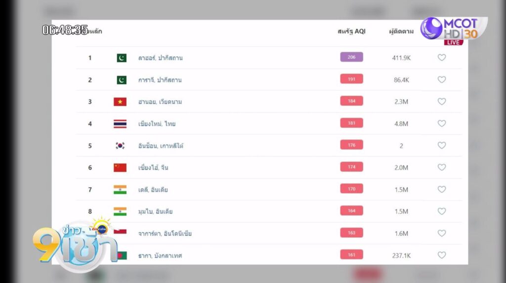 ข้อมูลจาก เว็บไซต์ IQ-Air รายงานค่าฝุ่น PM 2.5 เวลา 04.30 น. ที่ผ่านมา เชียงใหม่อยู่อันดับ 4 ค่า AQI อยู่ที่ 181 ส่วนอันดับ 1 คือ เมืองการาจี, ปากีสถาน 191 อันดับ 2 ฮานอย, เวียดนาม 183 และอันดับ 3 ลาฮอร์, ปากีสถาน 183